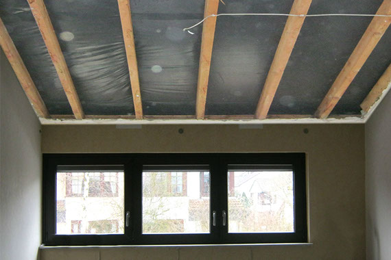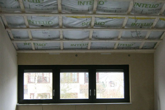 Montage der Luftdichtungsebene/Dampfbremse sowie Trockenausbau.