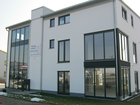 Der gesamte Glasfassadenbau des Eingangsbereiches des Therapiezentrums wurde von uns in Pfosten-Riegel-Konstruktion der Firma Schüco realisiert.