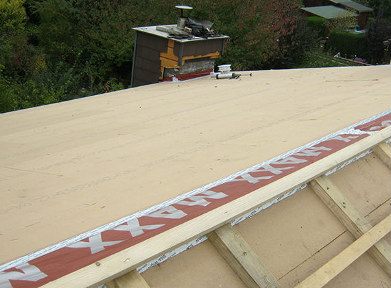Montage von Steico-Special-dry-Unterdeck-dämmplatten. Herstellung der Winddichtungsebene.